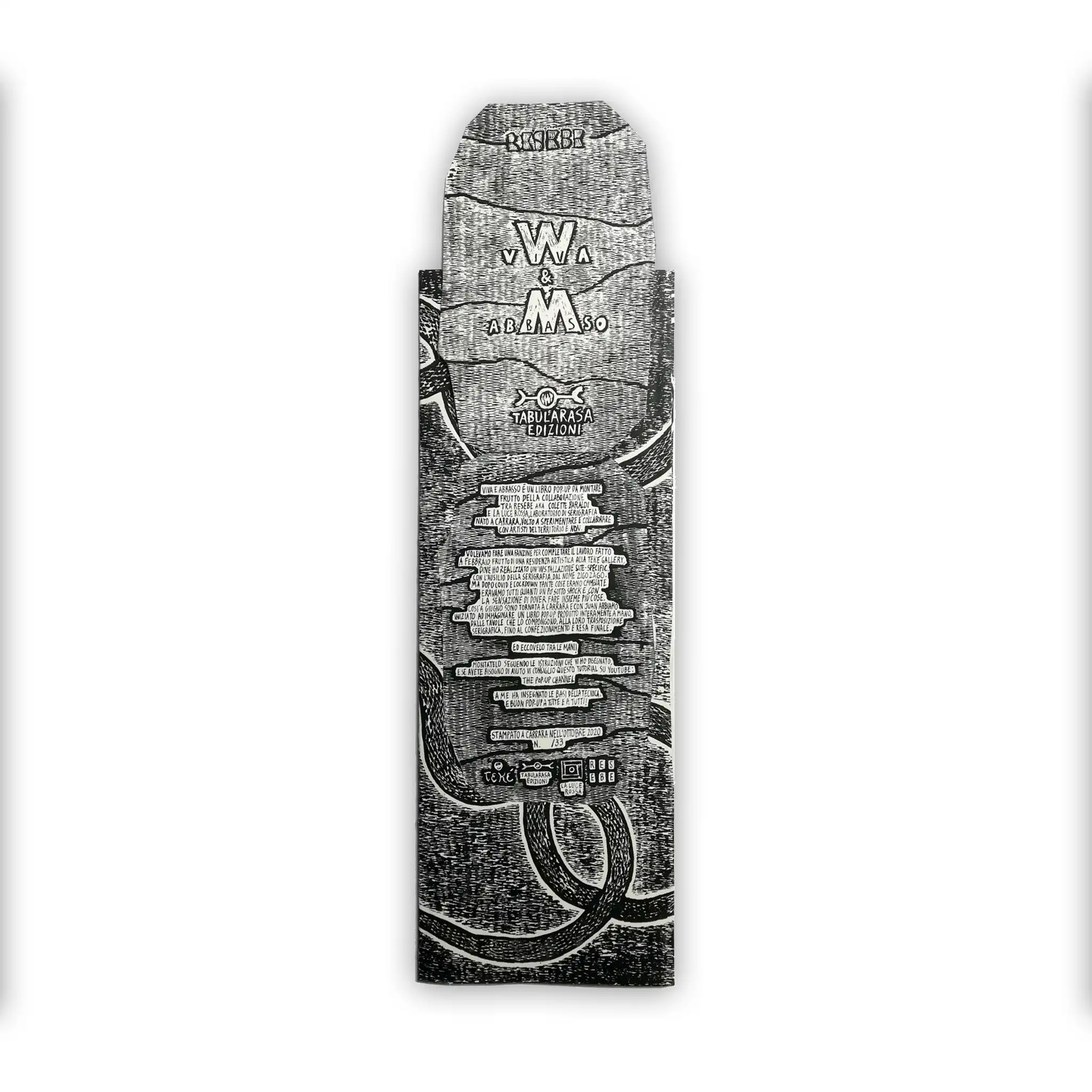 In continuity with the sign-space research initiated with ZigoZago—the site-specific installation created for Tekè Gallery in February 2020—ResEBE, together with Juan Carlos Allende from the screenprinting workshop La Luce Rossa, decided to deepen the experience with the creation of a fully screenprinted pop-up titled VIVA e ABBASSO, published by Tabularasa Edizioni.