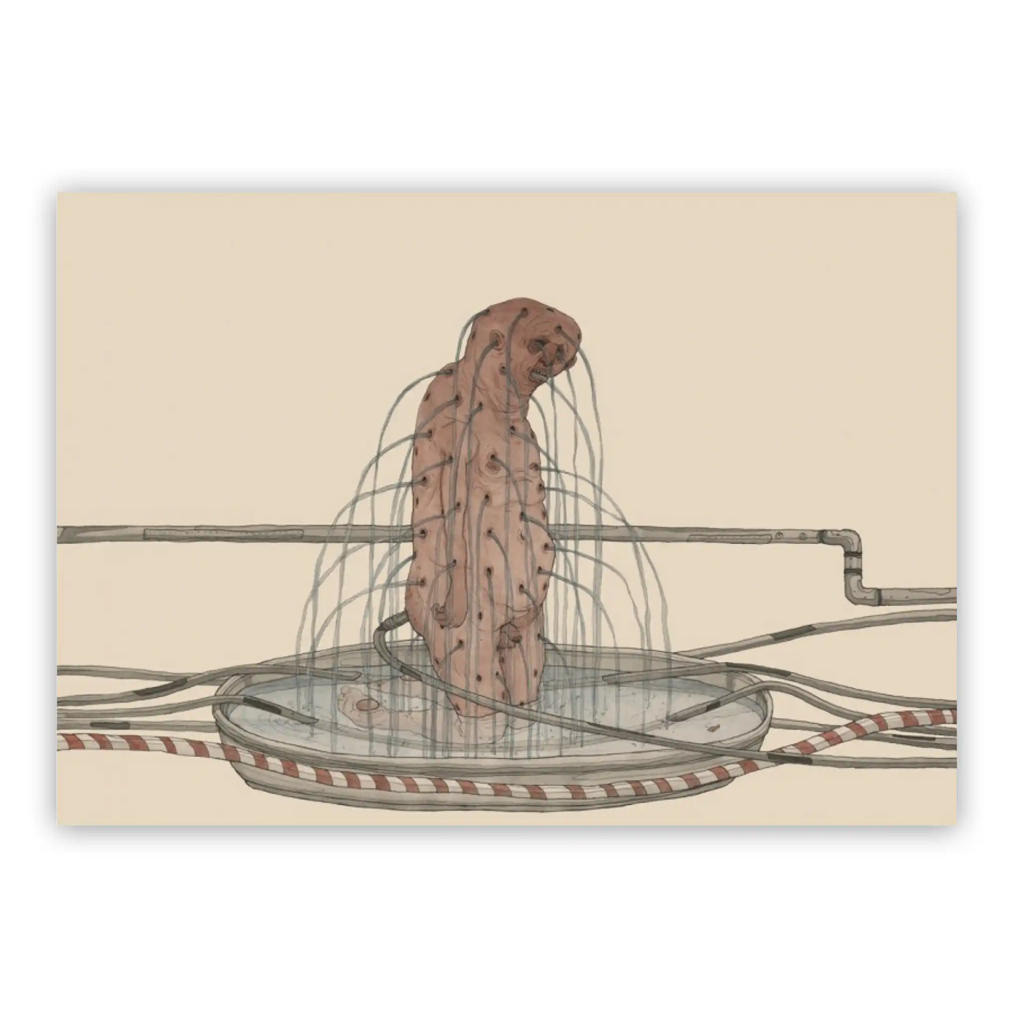 Per produrre una bottiglietta di plastica da 1 litro d’acqua se ne consumano 4, per una lattina di Coca Cola da 33 cl ne servono 200 litri e per un bicchiere di birra 300 litri. Mentre nel mondo ci sono persone che muoiono per le conseguenze della siccità, ogni anno in Italia si utilizzano 250 milioni di litri d’acqua per mantenere in funzione un parco divertimenti come Gardaland. Questi e molti altri dati, che ben quantificano gli sprechi compiuti quotidianamente dalla nostra società civilizzata, sono l’argomento del nuovo libro di Nemo’s, che si apre con un personaggio familiare intento a succhiare una cannuccia. Lo abbiamo già visto guardarci dai muri che fiancheggiano le strade delle nostre città e lo abbiamo conosciuto meglio nel volume Who is Nemo’s, pubblicato da #logosedizioni nel 2016. È l’incarnazione dell’uomo contemporaneo. La cannuccia, in questo libro che si snoda in orizzontale, in quindici tavole da affiancare una all’altra, striscia a terra e si trasforma in un tubo bicolore che si prolunga come un filo a cucire virtualmente tutte le pagine. Attraverso la cannuccia l’uomo attinge acqua dal pianeta, mentre le tubature proliferano fino a formare una selva intricata. Sono i tubi di una pompa di benzina, di una macchinetta del caffè, i tubi collegati agli annaffiatoi che gravano sulla schiena durante il lavoro nei campi. Non abbandonano l’uomo nemmeno quando fa i suoi bisogni e continuano a serpeggiargli intorno mentre pulisce il pavimento o siede nella vasca da bagno. Tutte situazioni quotidiane, in cui le tubature che ci circondano e solitamente rimangono nascoste vengono alla luce svelandoci come effettivamente utilizziamo la nostra risorsa più preziosa.