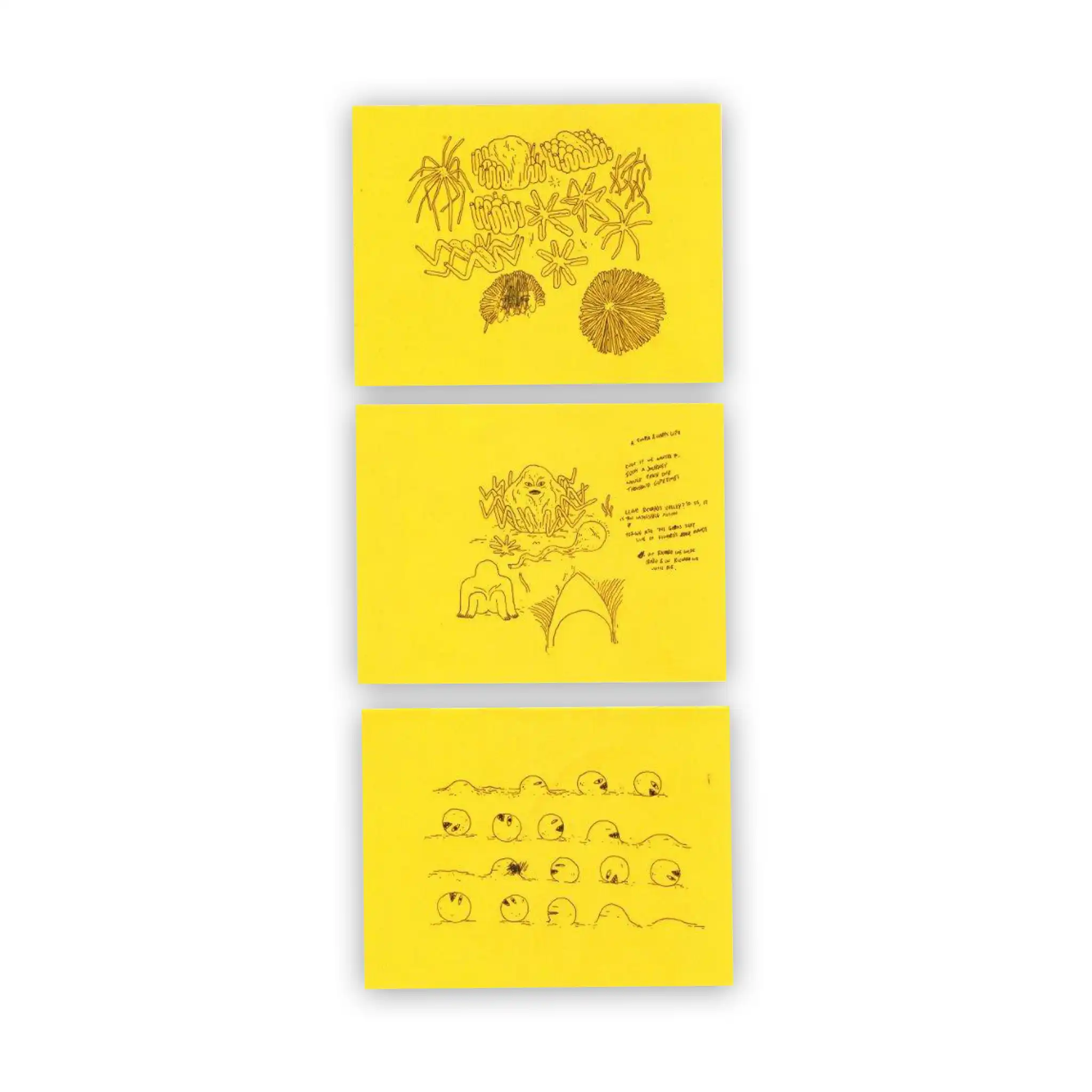 3 original ink sketches on orange paper.