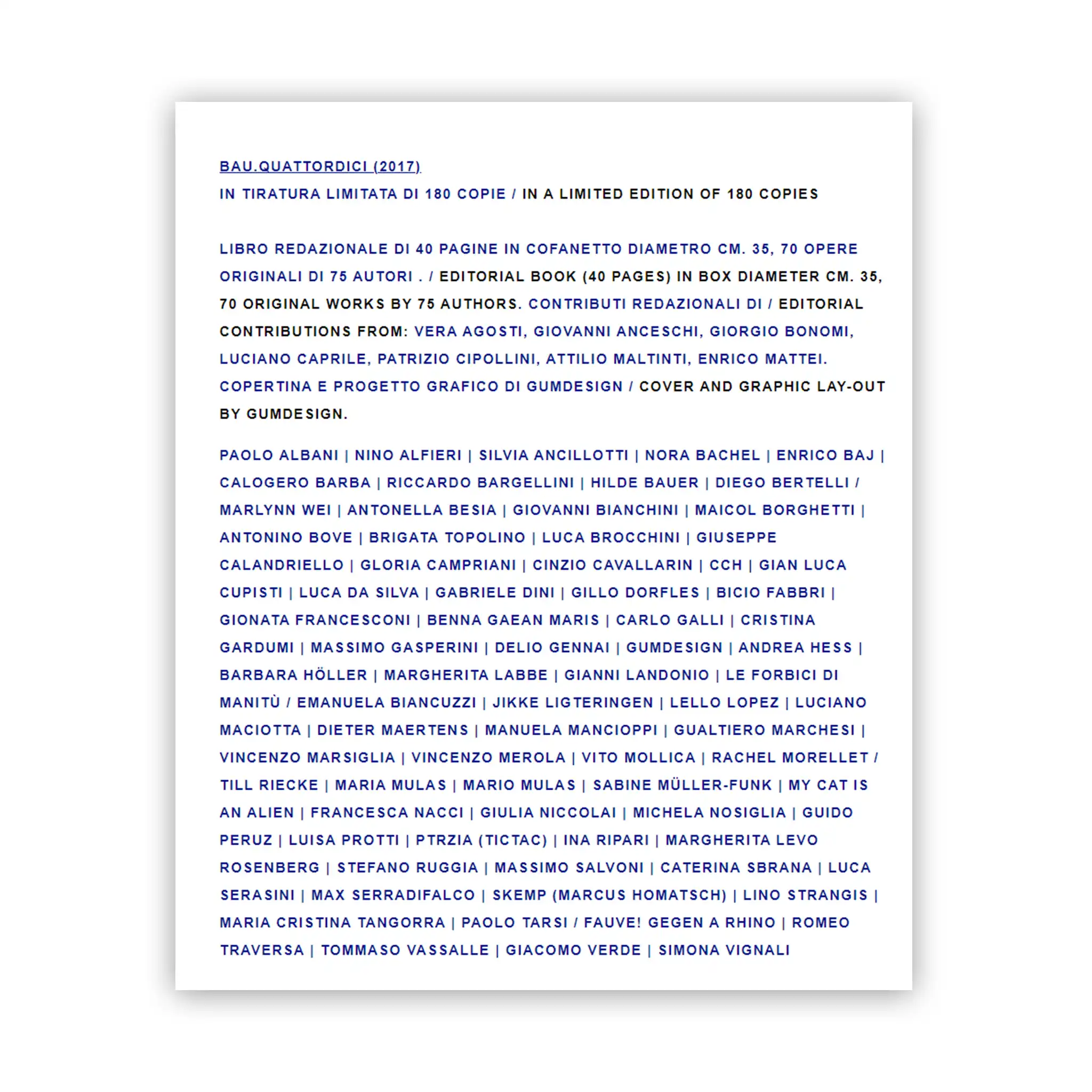 Paolo Albani, Nino Alfieri, Silvia Ancilotti, Nora Bachel, Enrico Baj, Calogero Barba, Riccardo Bargellini, Hilde Bauer, Diego Bertelli / Marlynn Wei, Antonella Besia, Giovanni Bianchini, Maicol Borghetti, Antonino Bove, Brigata Topolino, Luca Brocchini, Giuseppe Calandriello, Gloria Campriani, Cinzio Cavallarin, CCH, Gian Luca Cupisti, Luca Da Silva, Gabriele Dini, Gillo Dorfles, Bicio Fabbri, Gionata Francesconi, Benna Gaean Maris, Carlo Galli, Cristina Gardumi, Massimo Gasperini, Delio Gennai, GUMDESIGN, Andrea Hess, Barbara Höller, Margherita Labbe, Gianni Landonio, Le forbici di Manitù / Emanuela Biancuzzi, Jikke Ligteringen, Lello Lopez, Luciano Maciotta, Dieter Maertens, Manuela Mancioppi, Gualtiero Marchesi, Vincenzo Marsiglia, Vincenzo Merola, Vito Mollica, Rachel Morellet, Till Riecke, Maria Mulas, Mario Mulas, Sabine Müller-Funk, My cat is an alien, Francesca Nacci, Giulia Niccolai, Michela Nosiglia, Guido Peruz, Luisa Protti, PTRZIA (TICTAC), Ina Ripari, Margherita Levo Rosenberg, Stefano Ruggia, Massimo Salvoni, Caterina Sbrana, Luca Serasini, Max Sarradifalco, SKEMP (Marcus Homatsh), Lino Strangis, Maria Cristina Tangorra, Paolo Tarsi / Fauve! Gegen a Rhino, Romeo Traversa, Tommaso Vassalle, Giacomo Verd, Simona Vignali.